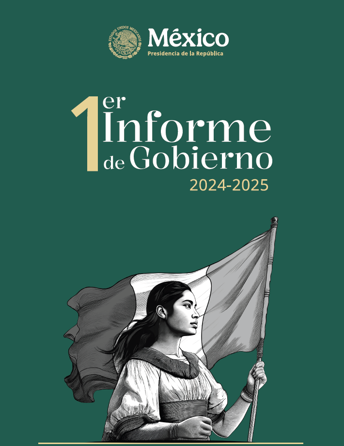 En su Primer Informe de Gobierno, la presidenta Claudia Sheinbaum presenta al Congreso de la Unión el estado que guarda la administración pública y los avances del Plan Nacional de Desarrollo 2025-2030. El documento destaca la consolidación del segundo piso de la Cuarta Transformación, con logros históricos en reducción de pobreza y desigualdad, incremento de ingresos familiares y duplicación del salario mínimo en términos reales. También resalta la expansión de programas sociales convertidos en derechos constitucionales, el fortalecimiento del Estado de bienestar, la generación récord de empleos formales y la inversión pública y privada en infraestructura y desarrollo regional. México mantiene estabilidad económica, crecimiento sostenido y confianza internacional, consolidando un modelo de desarrollo con justicia social, bienestar y sustentabilidad.